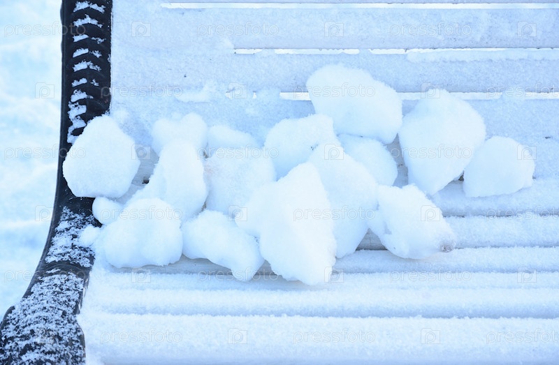 Куча снежков, сложенных на белой деревянной скамейке