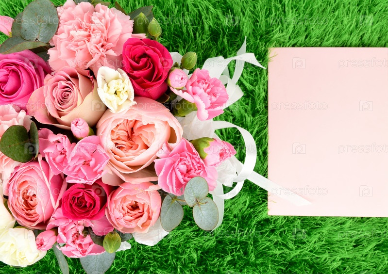 Вид сверху на цветы розы и гвоздики. Рядом лежит лист розовой бумаги для поздравлений