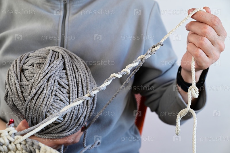 Женщина распутывает два клубка бежевых и серых ниток, которые запутались в процессе вязания
