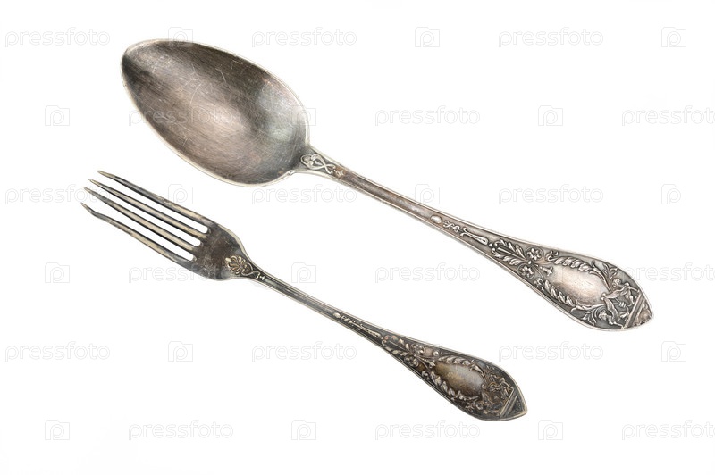 Вид сверху на столовую ложку и вилку с рельефными узорами на ручках. Оба из одного набора