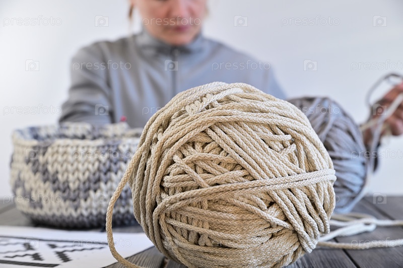 Большой клубок бежевого шнура. На заднем плане - горшки из этого шнура