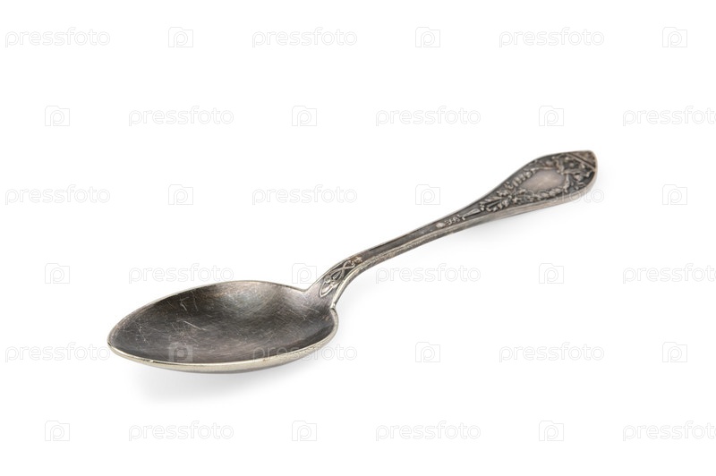 Вид сбоку на старую узорчатую столовую ложку черного цвета