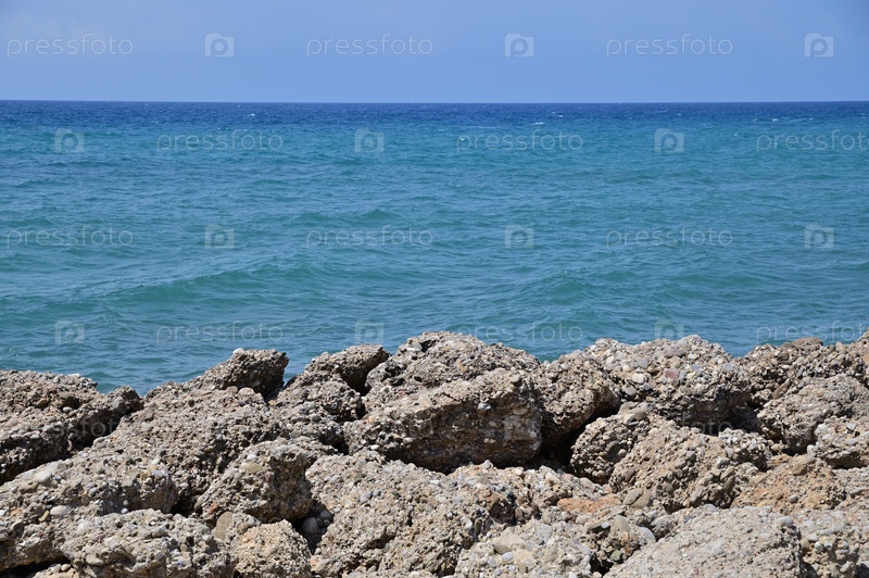 Скалистый берег, огромные камни, нагроможденные на берегу. Морской горизонт с голубой водой