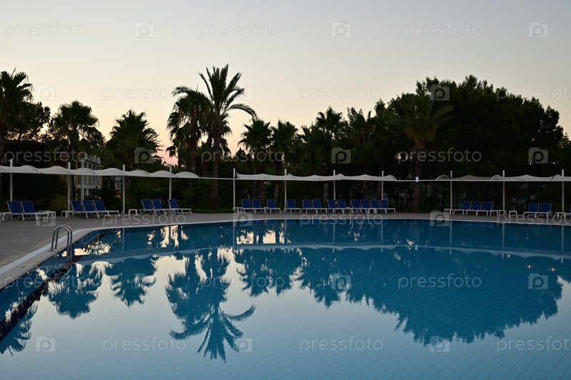 Бассейн со спокойной голубой водой в вечерних сумерках. Силуэты деревьев на фоне светлого неба