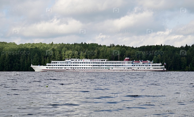 Большое многопалубное пассажирское судно на реке. Широкая река и густой лес на заднем плане