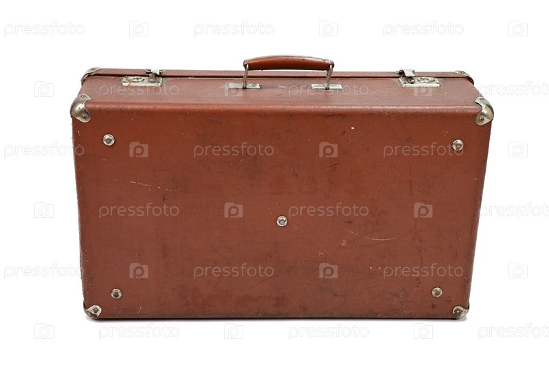 Старый картонный коричневый чемодан с металлическими углами и застежками. Чемодан закрыт и стоит ручкой вверх