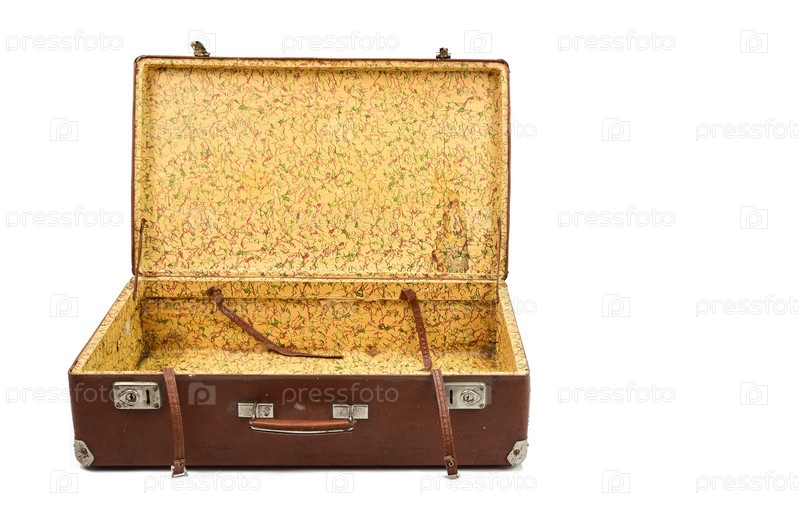 Старый картонный чемодан с металлическими уголками и застежками. Чемодан распахнут и из него торчат ремни для крепления одежды
