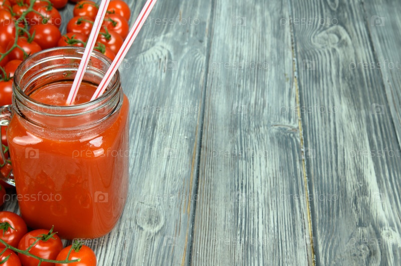 Банка томатного смузи с двумя трубочками вокруг пучков кустовых томатов. Изображение сделано на грубых серых досках