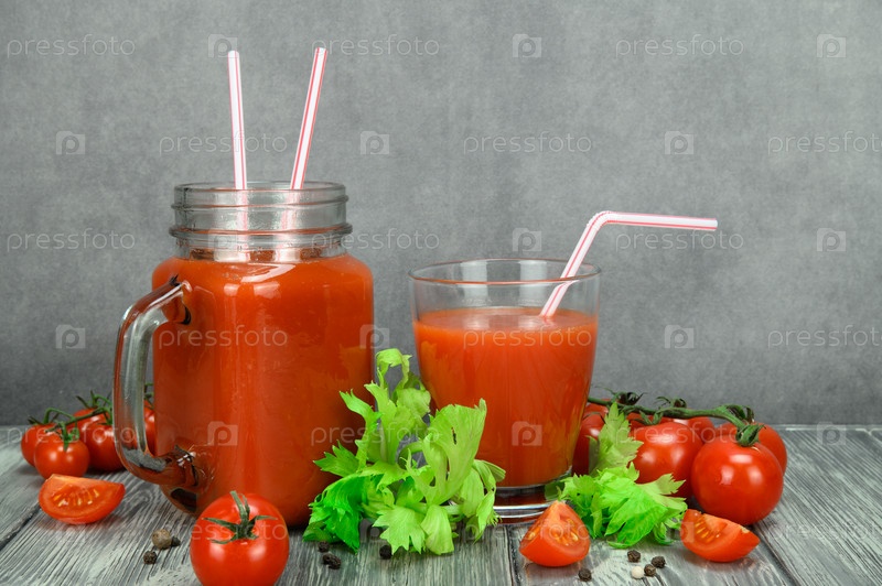 Стакан и банка томатного сока с трубочками. Листья петрушки, помидоры и душистый перец выложены вокруг