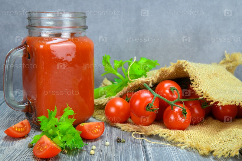 Банка томатного сока, листья петрушки и душистый перец. Помидоры завернуты в грубую льняную ткань