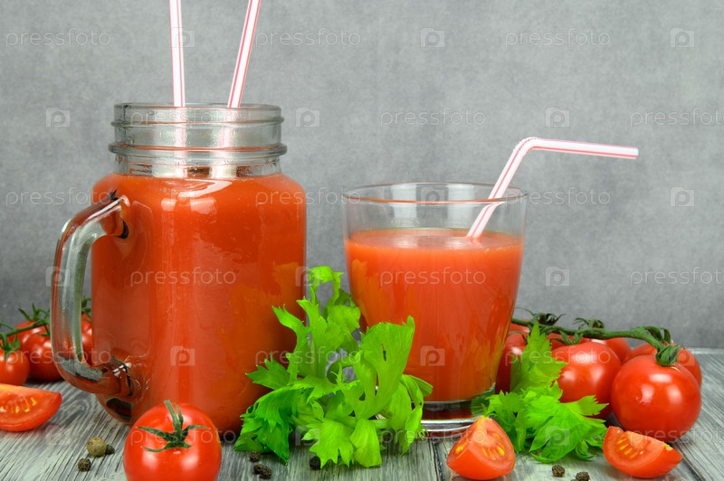 Стакан и банка томатного сока с трубочками. Листья петрушки, помидоры и душистый перец выложены вокруг