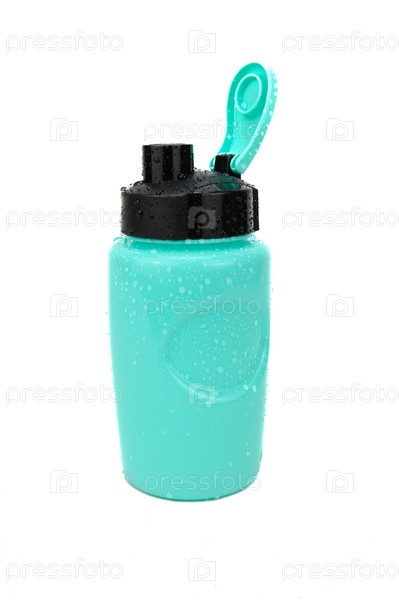 Пластиковая спортивная бутылка с полуоткрытой защелкой и капельками воды по бокам
