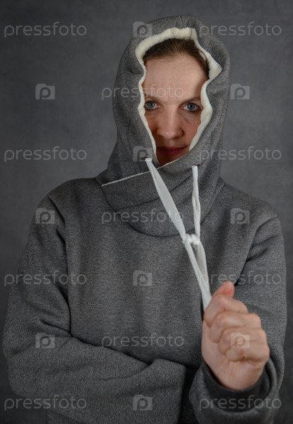 Привлекательная взрослая женщина в теплой толстовке с капюшоном затягивает завязки капюшона
