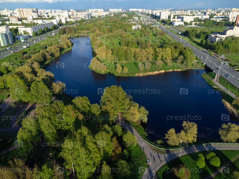 Вид с дрона на городской парк с мощеными велосипедными дорожками