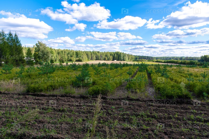 Вид с небольшого холма на еловую ферму. Ряды маленьких рождественских елок