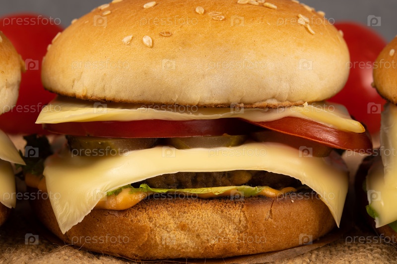 Поджаренный гамбургер в кунжутной булочке с солеными огурцами и спелыми помидорами. Из него торчат белые листочки плавленого сыра