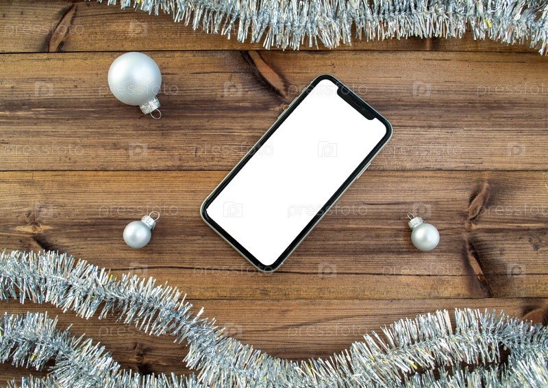 Макет, смартфон, новогодние шары и мишура на деревянном фоне