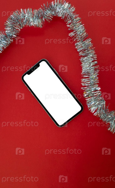 Макет, смартфон и мишура на красном фоне. Вертикальный фон