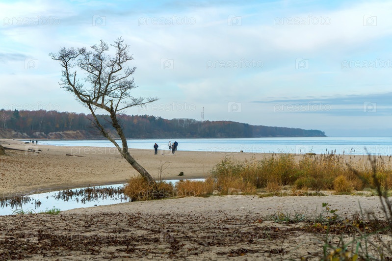 Калининград, Россия, Балтийское море - 2022, 13 ноября: Пасмурно на берегу моря. Живописное дерево на берегу моря. Прибрежный пейзаж