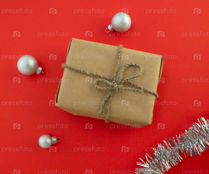 Новогодний праздничный фон, открытка. Подарок, елочные шары и мишура на красном фоне