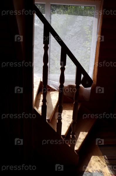 Фрагмент деревянной лестницы в прихожей сельского дома на фоне окна с занавесками