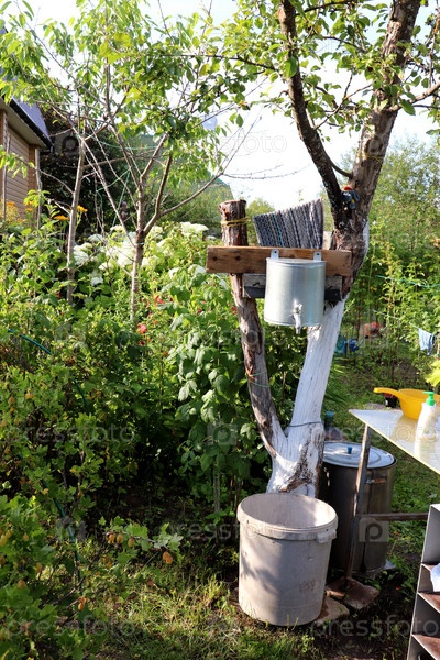 Садовый металлический рукомойник, умывальник на дереве в огороде сельского дома