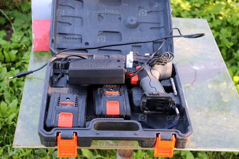 Электродрель в открытом пластиковом чемодане на столе в саду