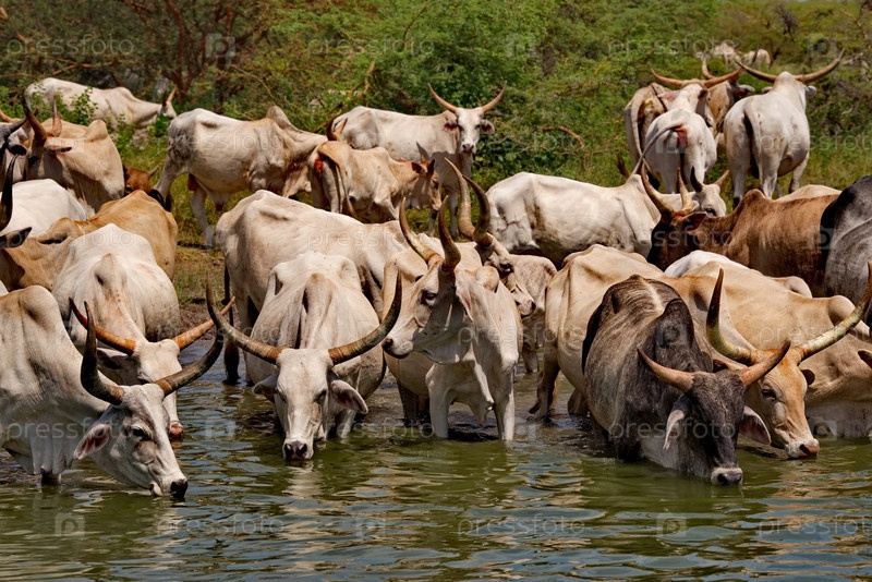 Западная Африка. Сенегал. Стадо горбатых коров зебу с огромными рогами пьет воду из небольшого озера на побережье Атлантического океана