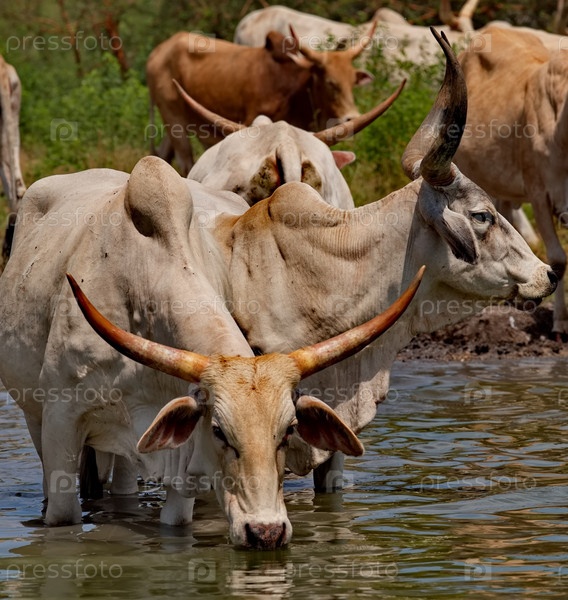 Западная Африка. Сенегал. Стадо горбатых коров зебу с огромными рогами пьет воду из небольшого озера на побережье Атлантического океана