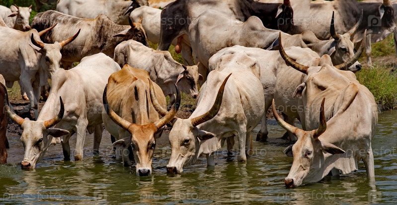Западная Африка. Сенегал. Стадо горбатых коров зебу с огромными рогами пьет воду из небольшого озера на побережье Атлантического океана