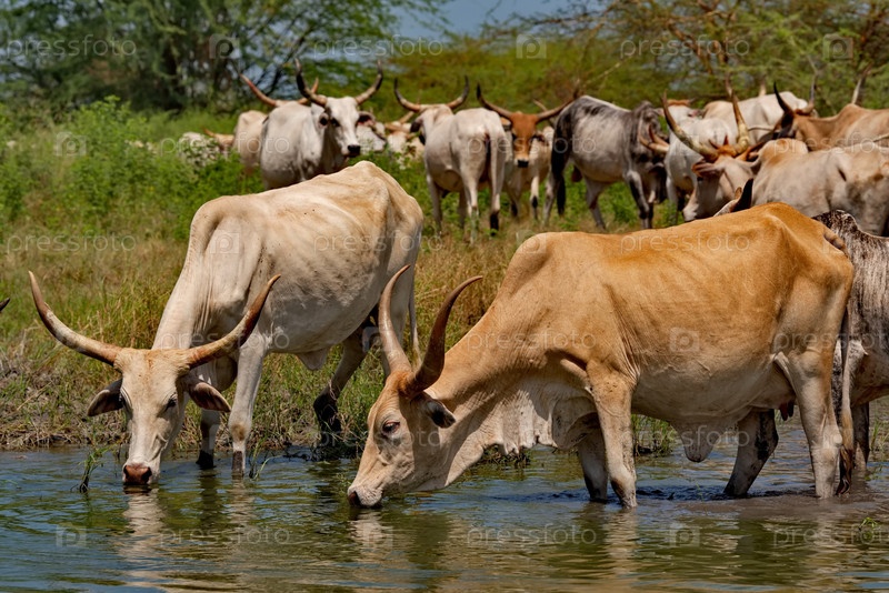 Западная Африка. Сенегал. Стадо горбатых коров зебу с огромными рогами пьет воду из небольшого озера на побережье Атлантического океана