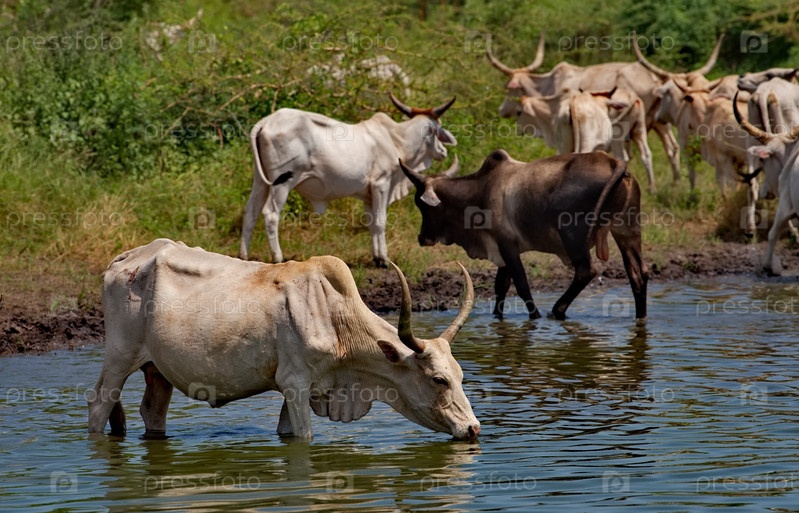 Западная Африка. Сенегал. Стадо горбатых коров зебу с огромными рогами пьет воду из небольшого озера на побережье Атлантического океана