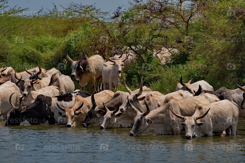 Западная Африка. Сенегал. Стадо горбатых коров зебу с огромными рогами пьет воду из небольшого озера на побережье Атлантического океана