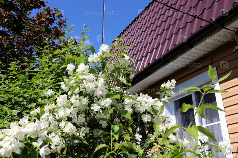 Цветущий куст белого чубушника, жасмина на фоне окон и крыши сельского дома в солнечный день
