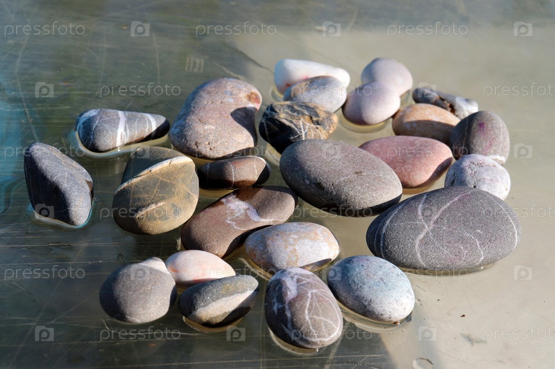 Морские разноцветные камни разной формы на влажном стекле в солнечном свете