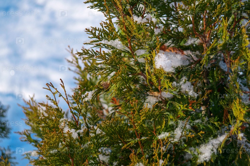 Зимняя снежная туя в лучах теплого солнца