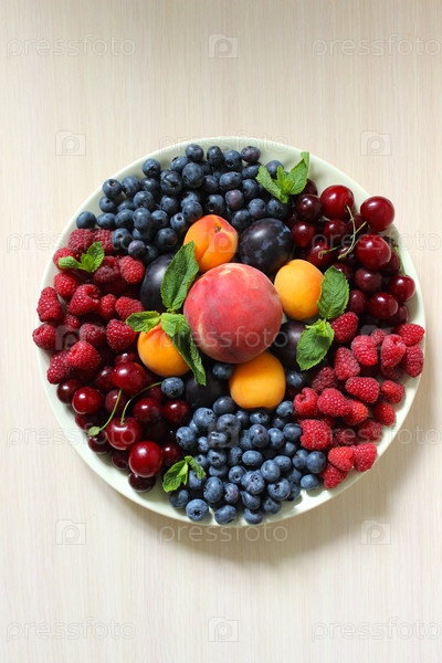 Тарелка, полная красочных и вкусных летних фруктов, включая персик, малину, чернику, абрикос, сливу и вишню, украшенная свежими листьями мяты