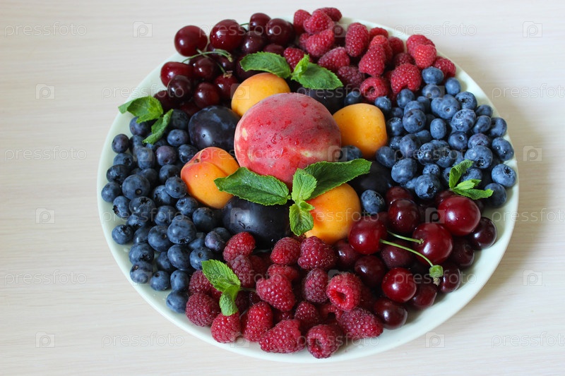 Красочная смесь сочных летних фруктов, разложенных на белой тарелке и украшенных свежими листьями мяты, создает яркую и полезную композицию