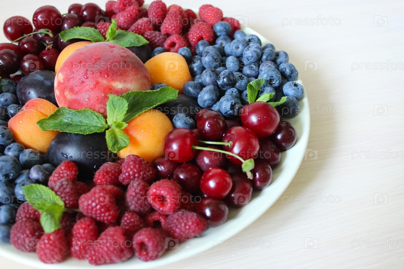 Вкусный микс из красочных летних фруктов на белой тарелке, украшенный свежими листьями мяты