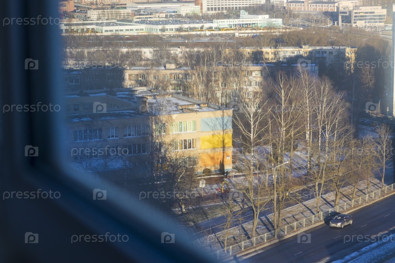 Типичный восточноевропейский город, увиденный через окно зимой. Концепция