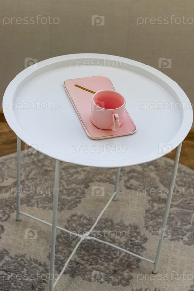 Журнальный столик с розовой чашкой для дам на нем. Концепция