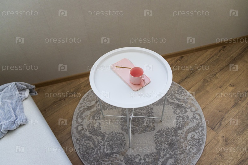 Журнальный столик с розовой чашкой для дам на нем. Концепция