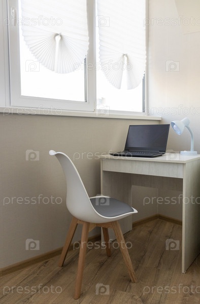 Маленькое рабочее место в квартире. Ноутбук на столе. Интерьер
