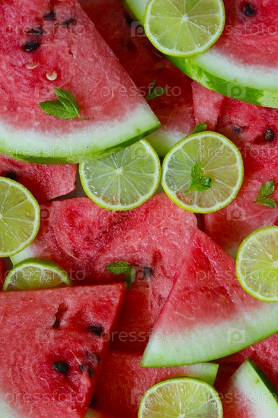 Кусочки спелого арбуза и лайма, украшенные листьями мяты, создают освежающий летний фон