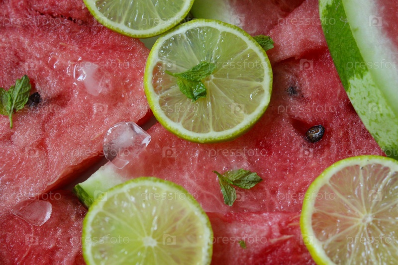 Кусочки арбуза, украшенные листьями лайма и мяты с кубиками льда