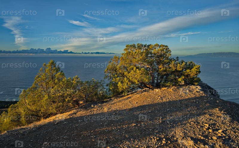 Россия, Новый Свет. Потрясающий вид на рассвете с мыса Капчик на окружающую бухту Крымского полуострова