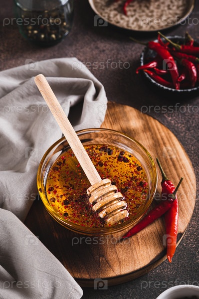 Миска горячего меда с красным перцем на столе, вертикальный вид