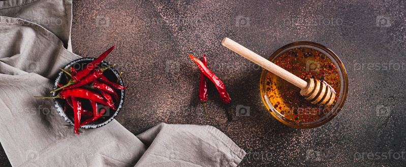 Миска горячего меда с красным перцем на столешнице веб-баннер