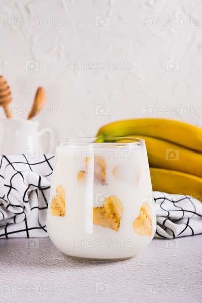 Альтернативное безлактозное банановое молоко в стакане на столе вертикальный вид