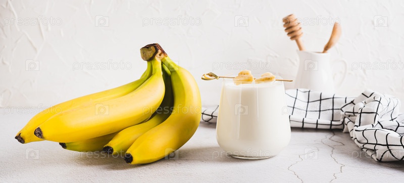 Альтернативное банановое молоко без лактозы в стакане на веб-баннере стола